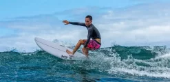 This board is made with a polyurethane polyester construction and a center stringer and come with 3 Futures fins.