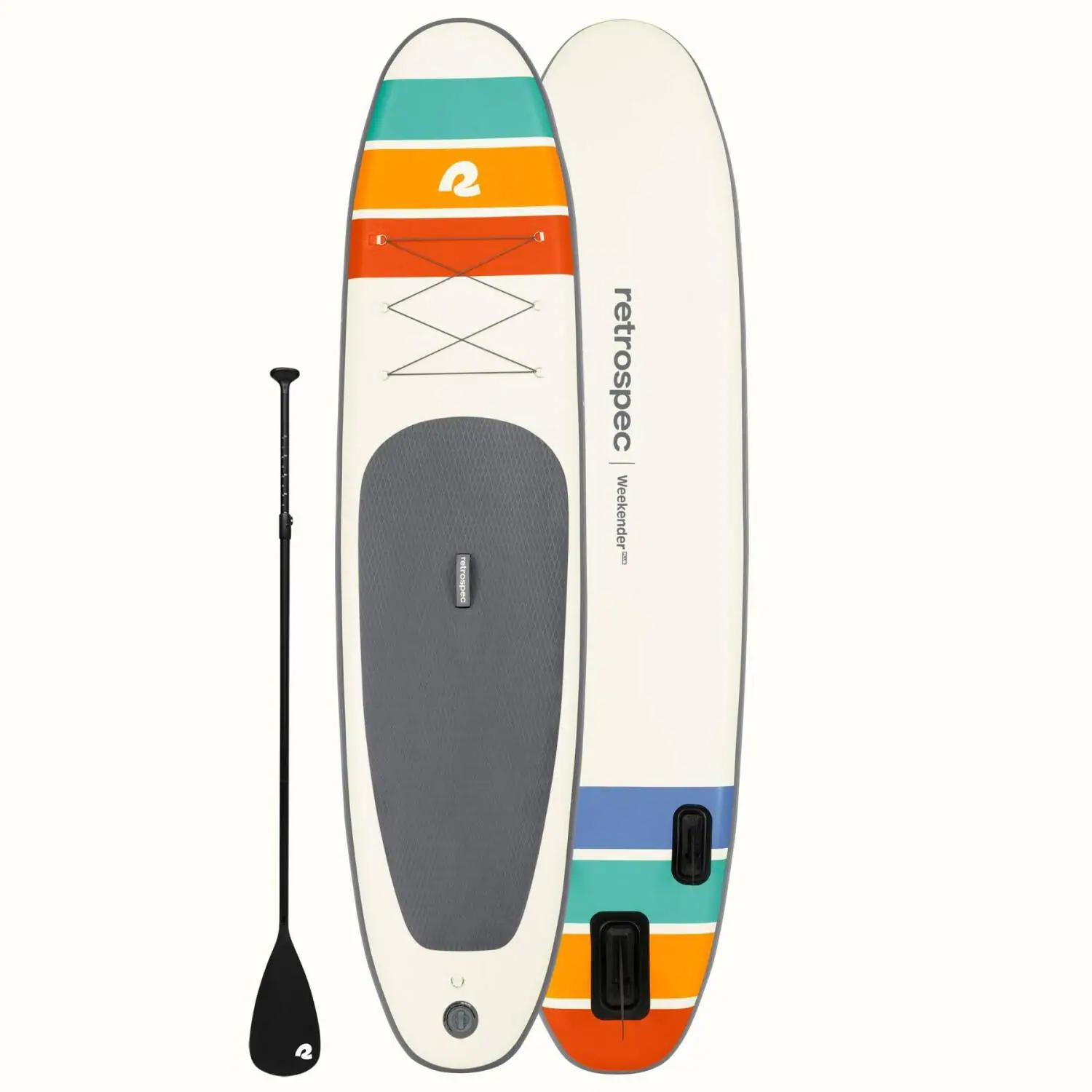 The Retrospec Weekender 10′ Plus (Double layer) Inflatable Paddle Board is the most compact board in Retrospecs line-up and is designed on max weight on 300lbs in mind. It’s a beginner-friendly all-around SUP package with everything you need to go to the waters and stay there for hours. The wide and rounded shape makes it stable and easier to step onto, and the reinforced carry handle in the middle makes it convenient to transport – even for smaller fellas.